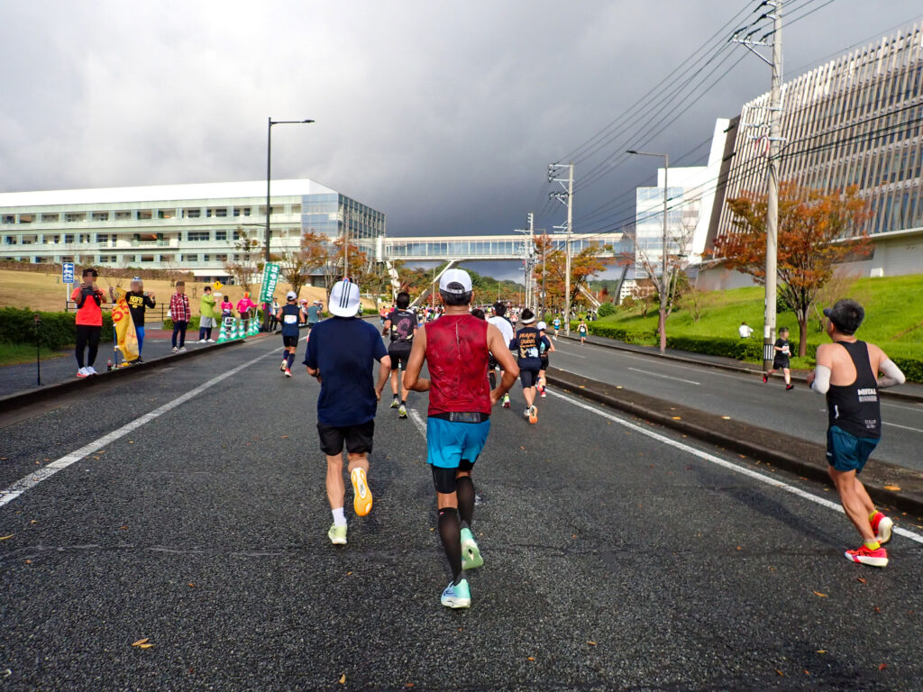 九州大学伊都キャンパス内では、応援団の熱い声援が走りを後押ししてくれます。