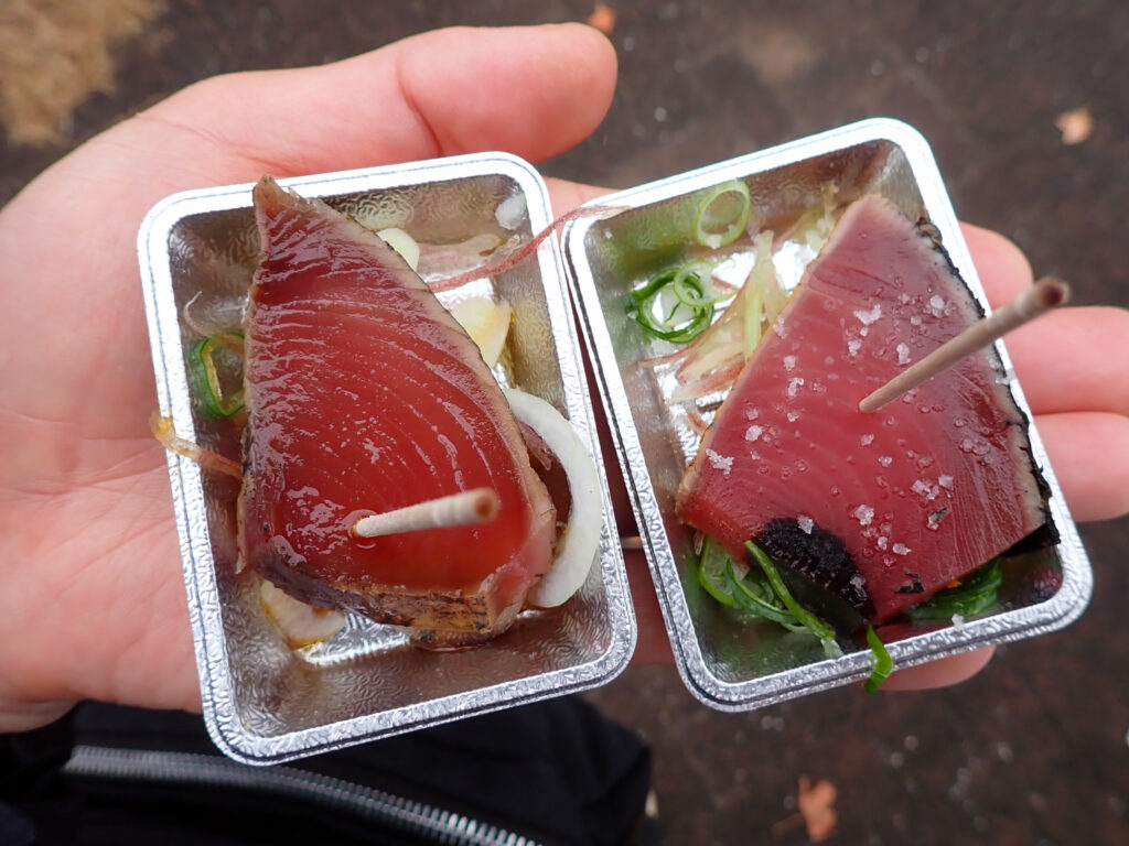 ゴール地点では、かつおのたたきが振る舞われます。- アクセス