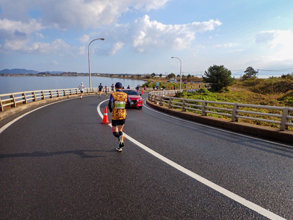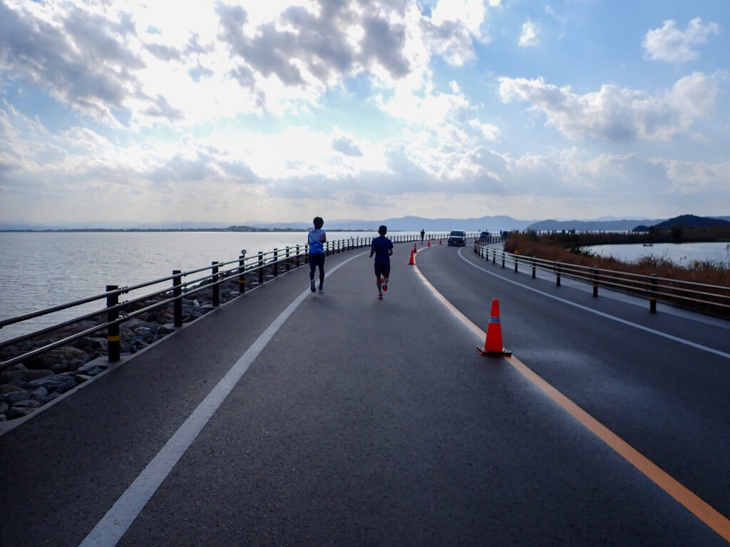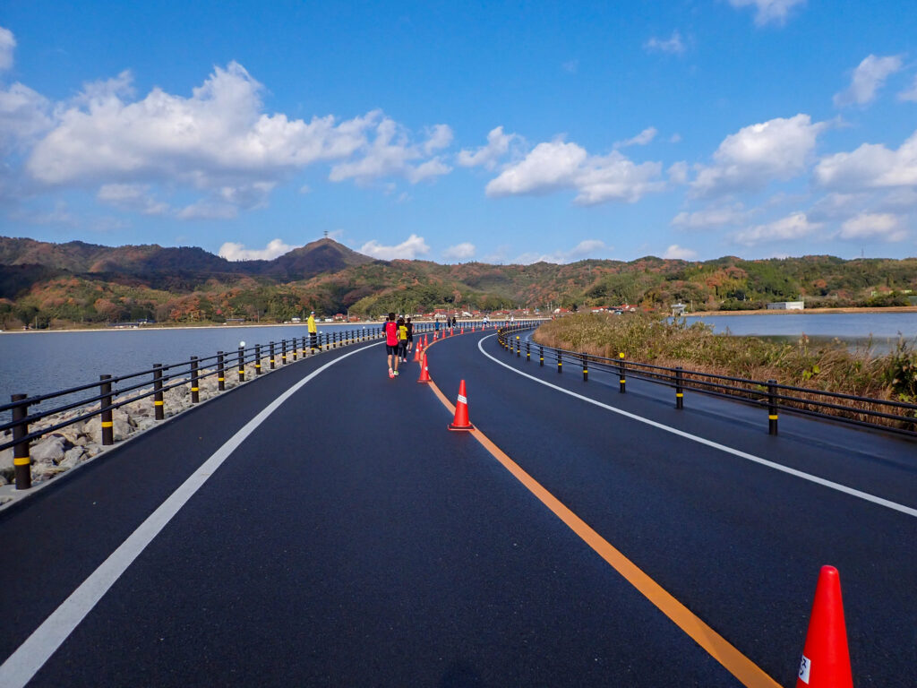 松江市総合体育館をスタートし、松江城や松江駅のそばを通って中海(なかうみ)方面へ進み、大根島、江島を巡って再び体育館へ戻るコースです。